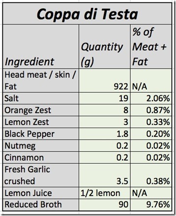 Unfortunately I don't have a head but will be using hocks, feet and a beauty of a beef tongue. I like your combination of aromatics, especially the lemon and orange rind and will incorporate them into my salceson. In using a small amount of Cure 1 in my cooking broth I get a nice red colour that enhances it visually.